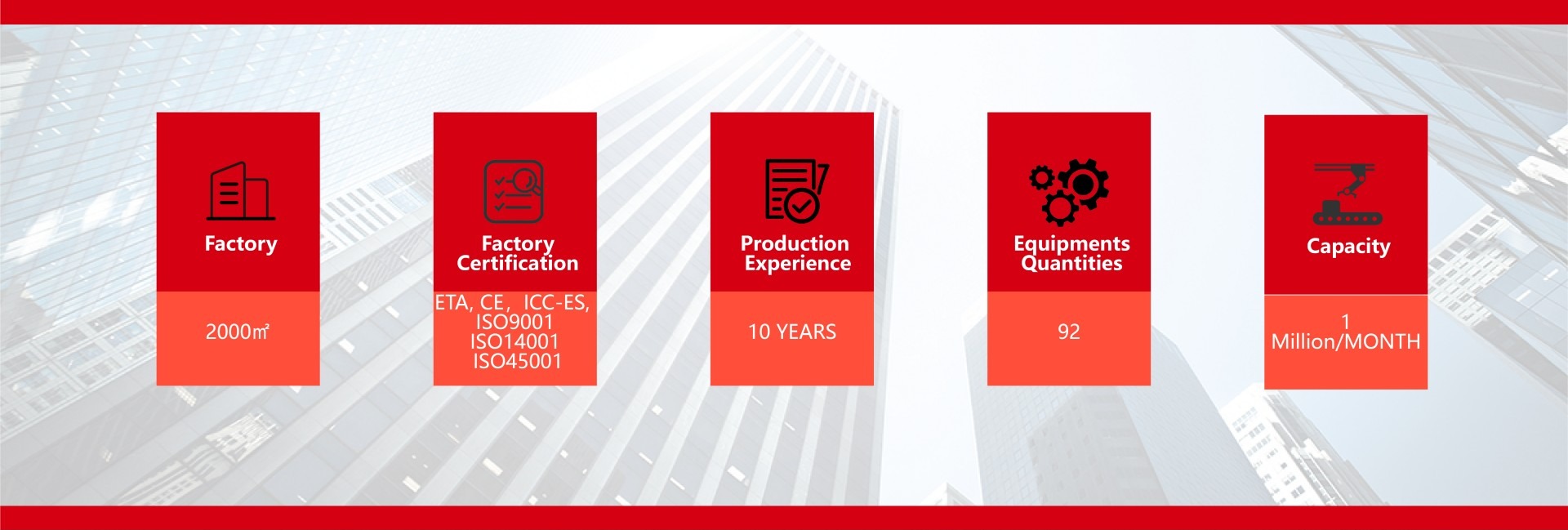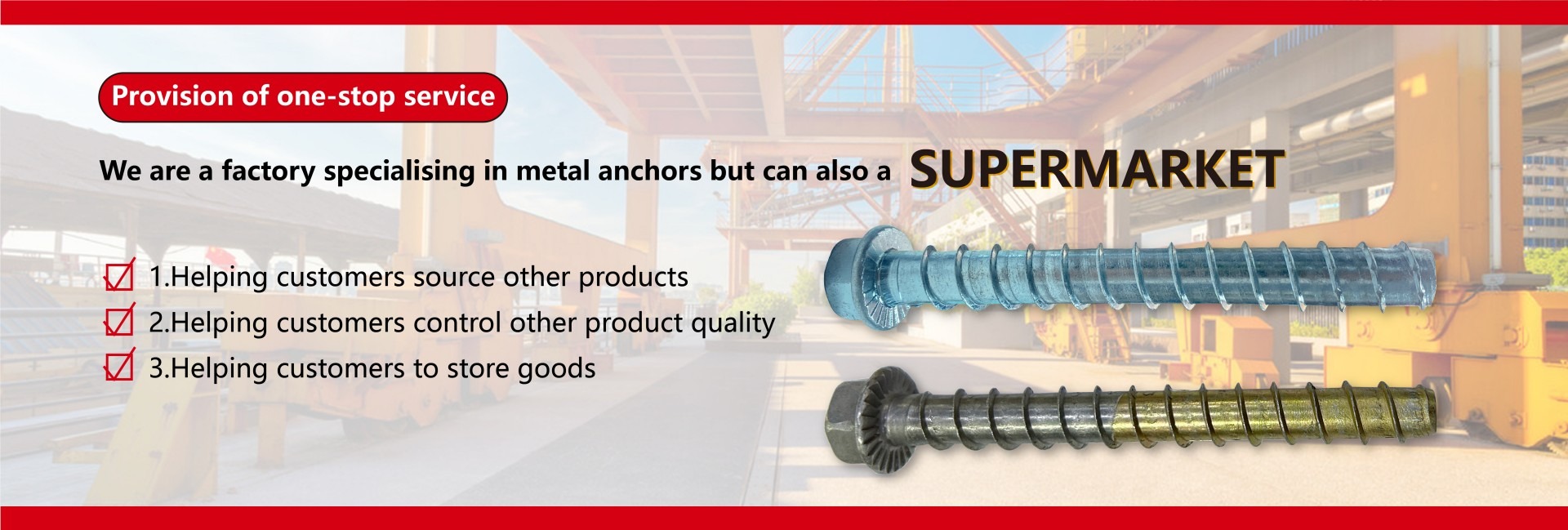 Productos principales:Tornillos de hormigón, anclajes de cuña, anclajes químicos, anclajes de marco, anclaje de alta resistencia